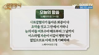 오늘의 말씀 | 느헤미야 8:1~18 [생명양식] 행복한 쉼터, 사랑의 채널 'GOODTV 기독교복음방송'입니다! GOODTV를 통해 받은 은혜를 나눠주세요! 후원문의 : 1522-5221 후원신청 : http://m.goodtv.co.kr/json/cms_redirect.asp 후원ARS : 060-707-0000 (1통화 1만원) 후원계좌 : 060-704-1004 (은행 | 기업은행 , 예금주 | 기독교복음방송) * 시청방법 - IPTV: KT Olleh TV 234번, SKB Btv 303번, LG U+ 273번 - 위성TV: ...